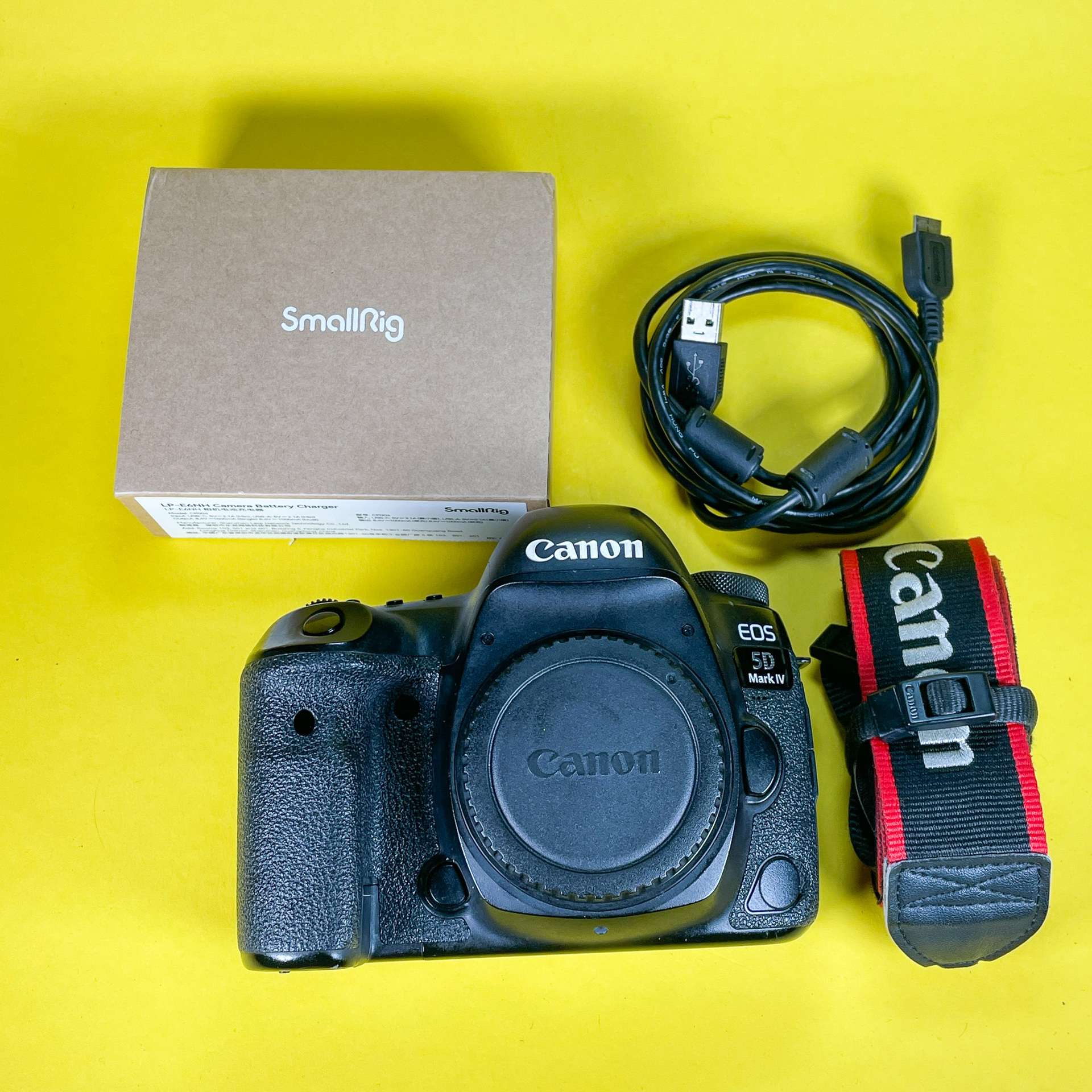 fotoaparát, smallrig USB nabíječka, krytka, 1x baterie canon, Cflash karta Pretec 128GB, usb kabel