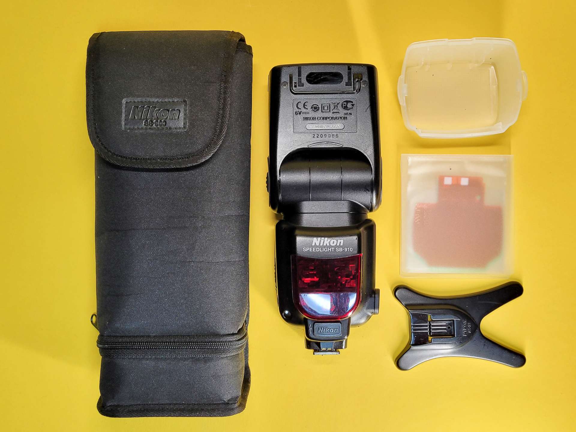 blesk, pouzdro (od SB900), difuzéry, barevné filtry, stojánek
