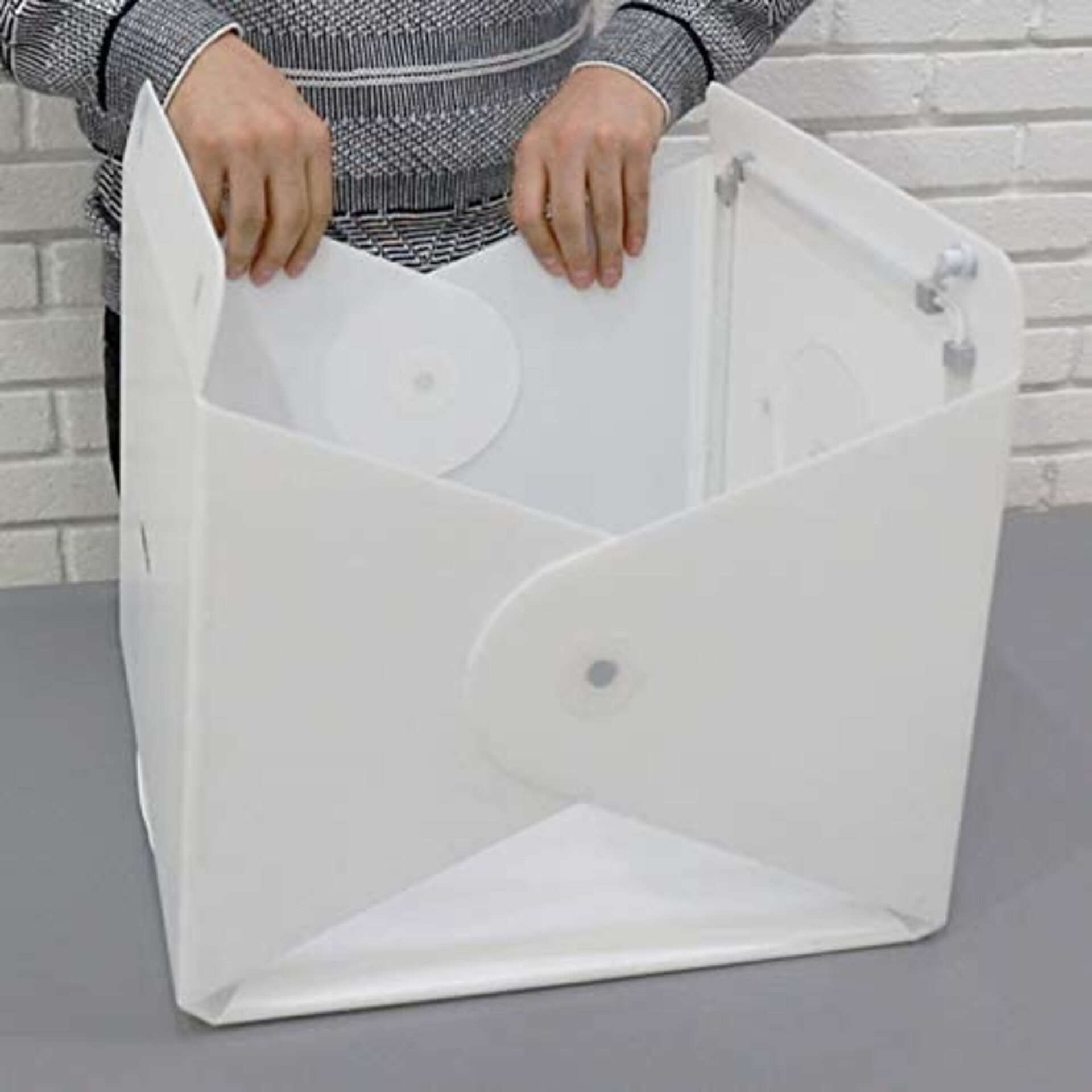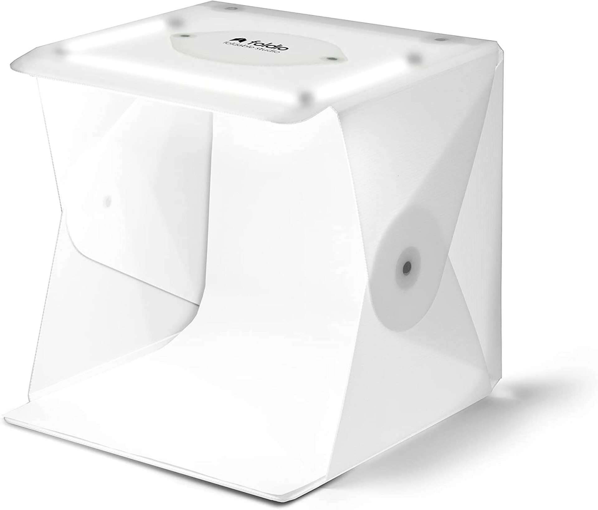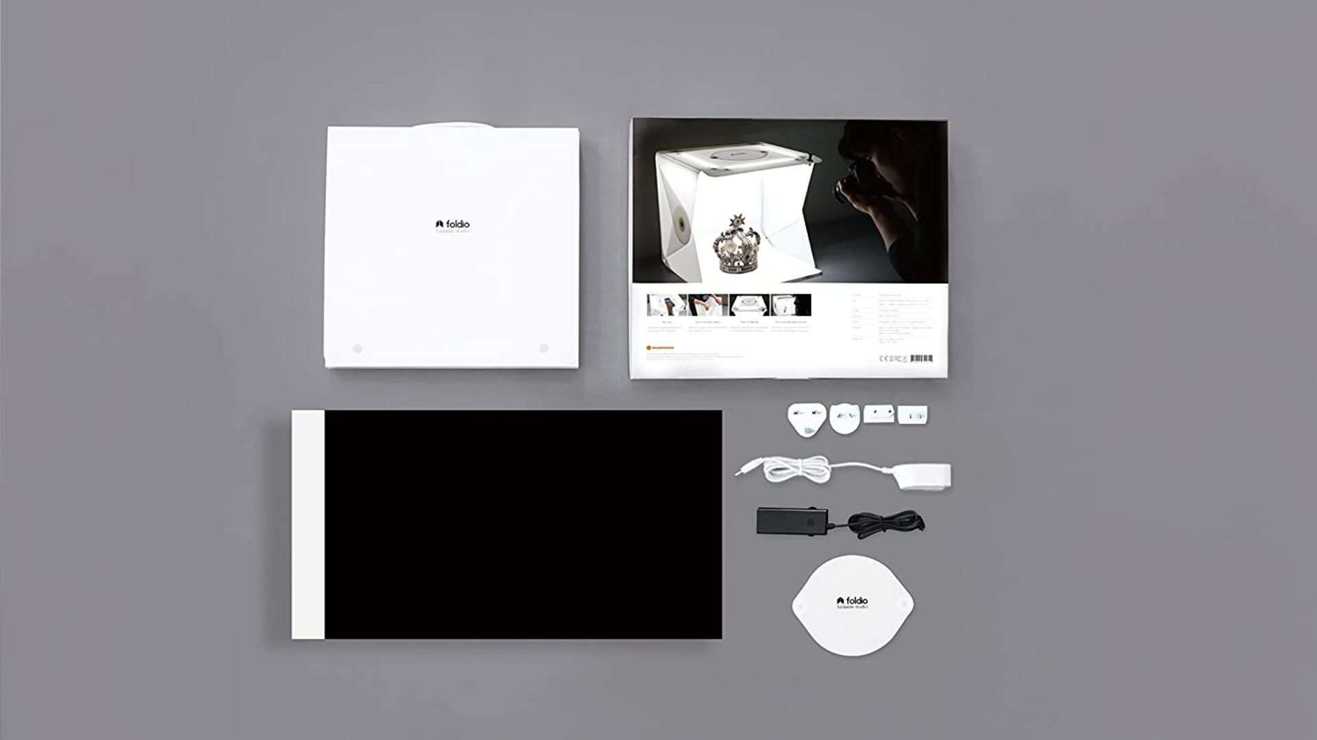 Světelný box s předinstalovaným LED osvětlením, Halo Bar, Horní kryt, Regulátor stmívání, Mezinárodní adaptér (US, UK, AU, EU), 2 kulisy (bílá, černá), Držák pozadí, Návod k použití