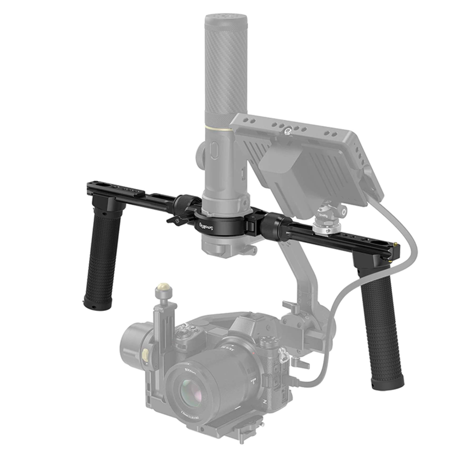 Duální rukojeť SmallRig pro ruční stabilizátor ZHIYUN CRANE 2S 3004 je navržena tak, aby snižovala únavu rukou, zejména při dlouhém natáčení, a poskytovala další úchyty pro příslušenství při natáčení se stabilizátorem CRANE 2S. Dvojitá rukojeť se na gimbal upevňuje pomocí rychloupínací svorky a je uvnitř opatřena gumovými podložkami, které chrání gimbal před poškrábáním. Je vybaven několika otvory se závity 1/4"-20 a ARRI 3/8"-16 pro montáž nejrůznějšího příslušenství, například samostatně dostupných ramen Magic Arm 2115 a 2070 pro přidání 5" monitoru. Rameno je na obou stranách integrováno s úchyty pro montáž monitoru 2905 a audio přijímače. Kromě toho je rukojeť horizontálně nastavitelná pomocí integrované tyče NATO a můžete snadno změnit směr rukojeti, abyste ji mohli držet v režimu vzhůru nohama. Modulární rukojeť lze rozložit na pět částí pro skladování a přepravu.