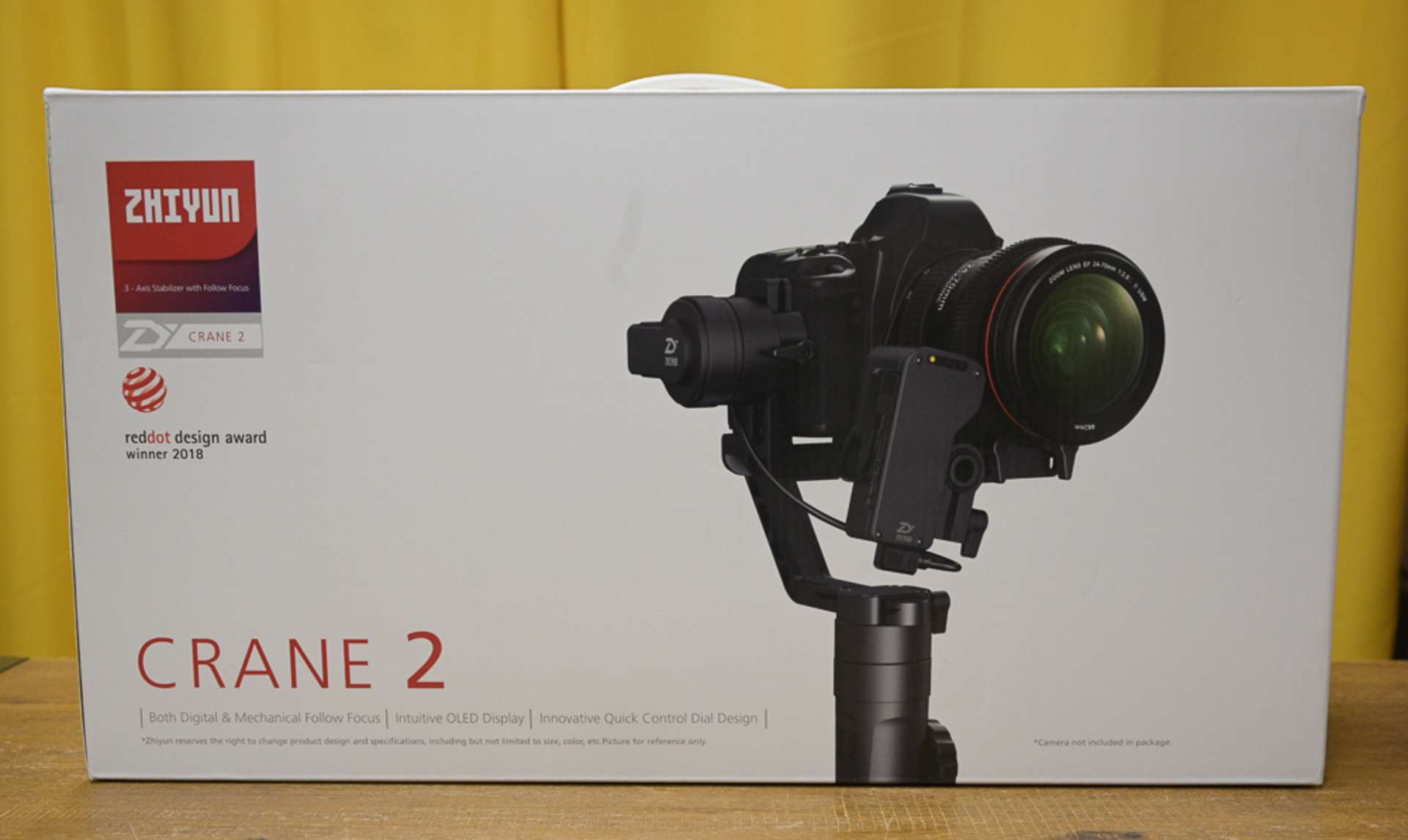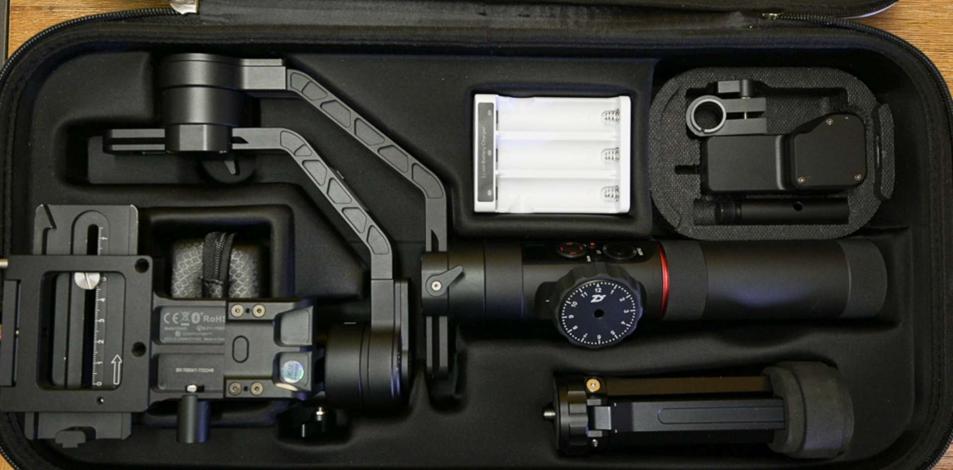 Gimbal, kufr, 3x baterie, nabíječka, stativ, destička, motor ostření, kabeláž, kufr, krabice
