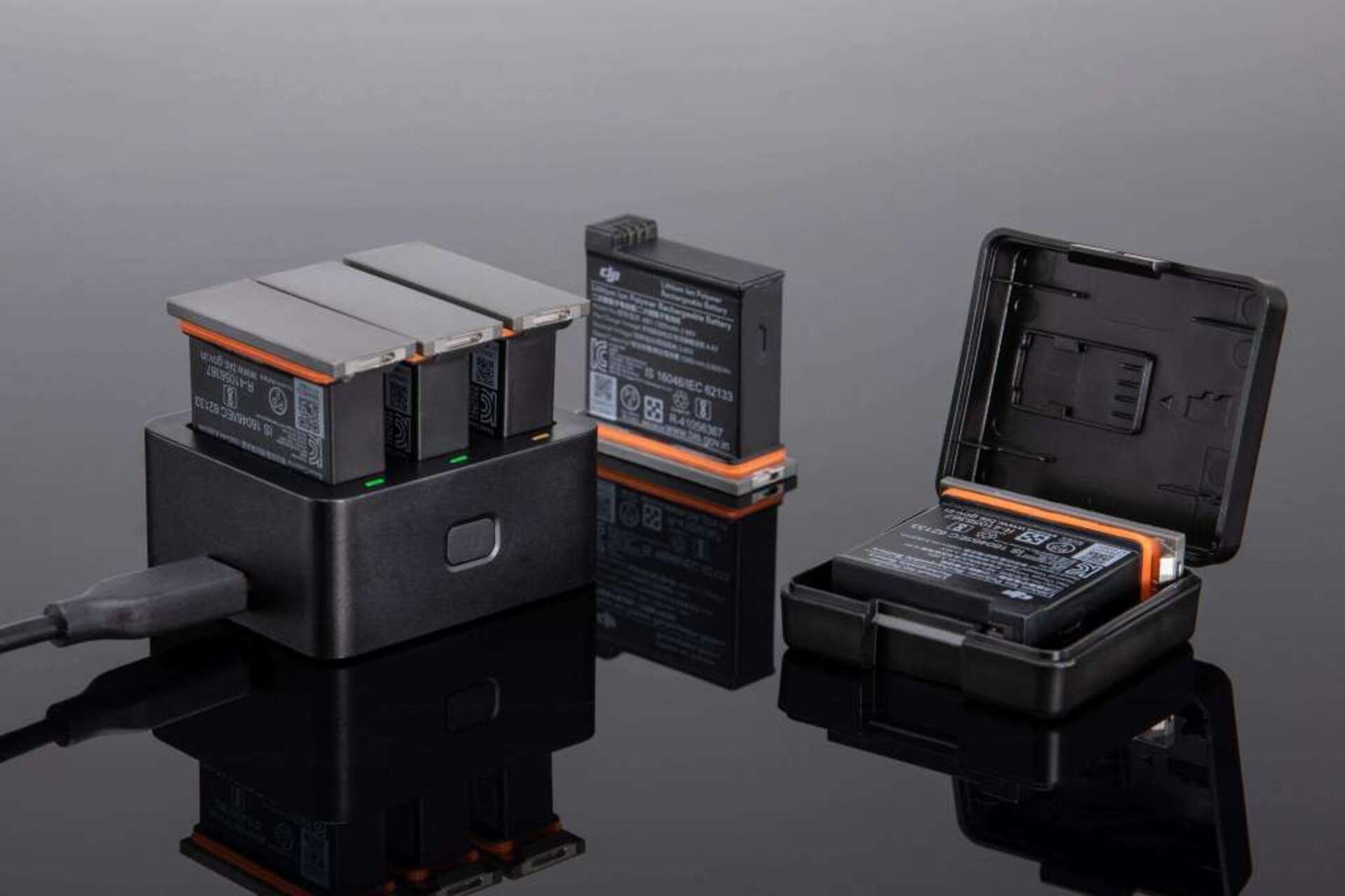 Baterie pro kameru Osmo Action mají dva zámky pro snadnou instalaci. Maximální kapacita každé z baterií je 1 300 mAh, což výrazně prodlužuje dobu záznamu (až 135 minut záznamu 1080p30, až 63 minut 4K60 záznamu). Pouzdro na baterie dokáže pojmout a chránit hned několik baterií a microSD karet. Umožňuje vám rozdělit a skladovat baterie do oddílů označených různými značkami úrovně nabití baterie.