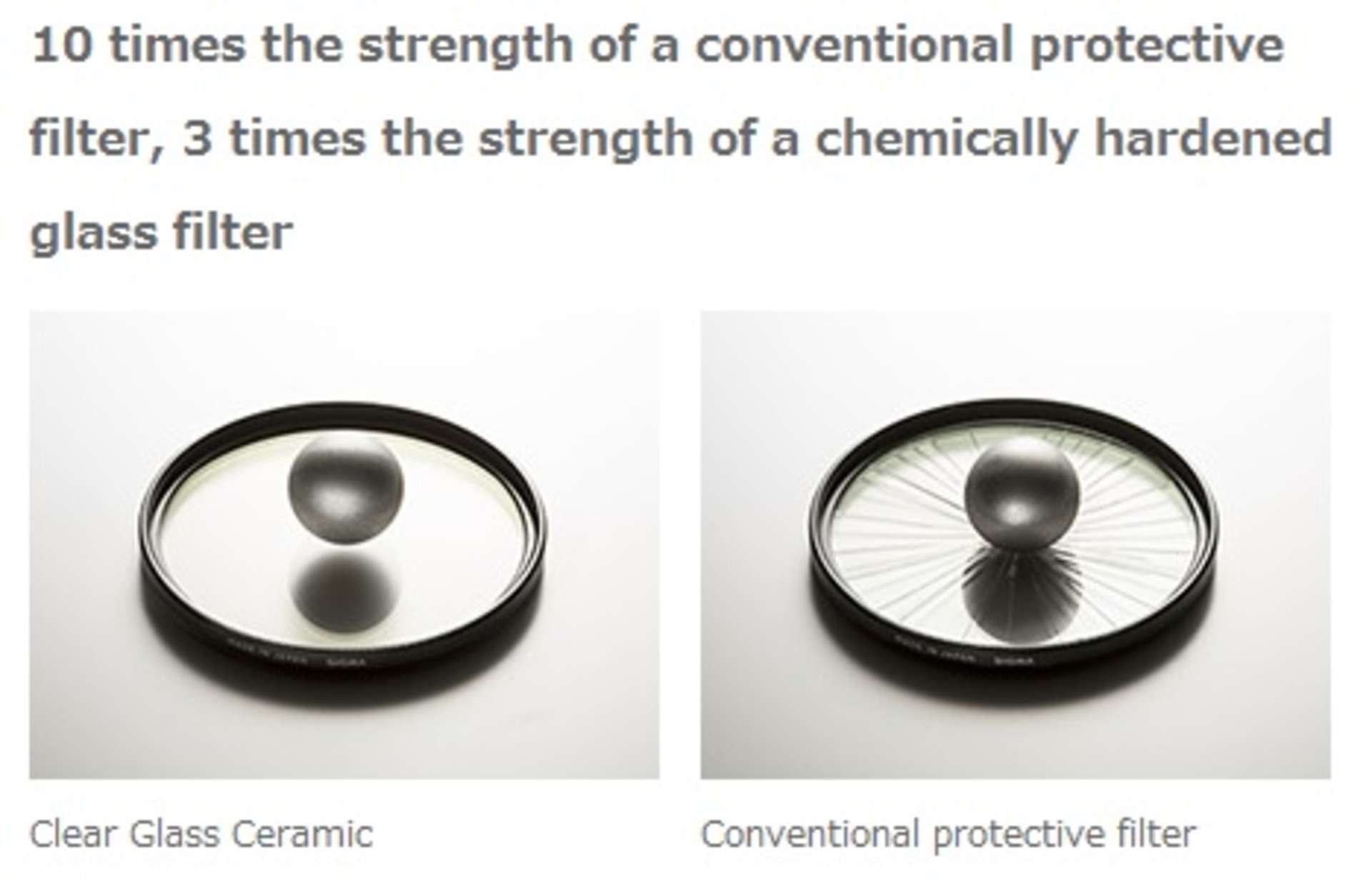 Nejvyšší řada ochranných filtrů SIGMA PROTECTOR CERAMIC WR je absolutní špičkou ve své třídě a byla navržena s cílem uspokojit potřeby těch nejnáročnějších profesionálů, kteří vyžadují nekompromisní ochranu drahé optiky. Zcela nový typ optického skla s názvem Clear Glass Ceramic, který vznikl ve spolupráci s firmou Ohara Corporation, patřící již více než 80 let mezi světově uznávané výrobce kvalitního optického skla, vyniká oproti konvenčním ochranným filtrům až 10x vyšší tvrdostí a oproti chemicky tvrzeným ochranným sklům až 3x vyšší tvrdostí.